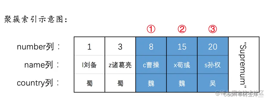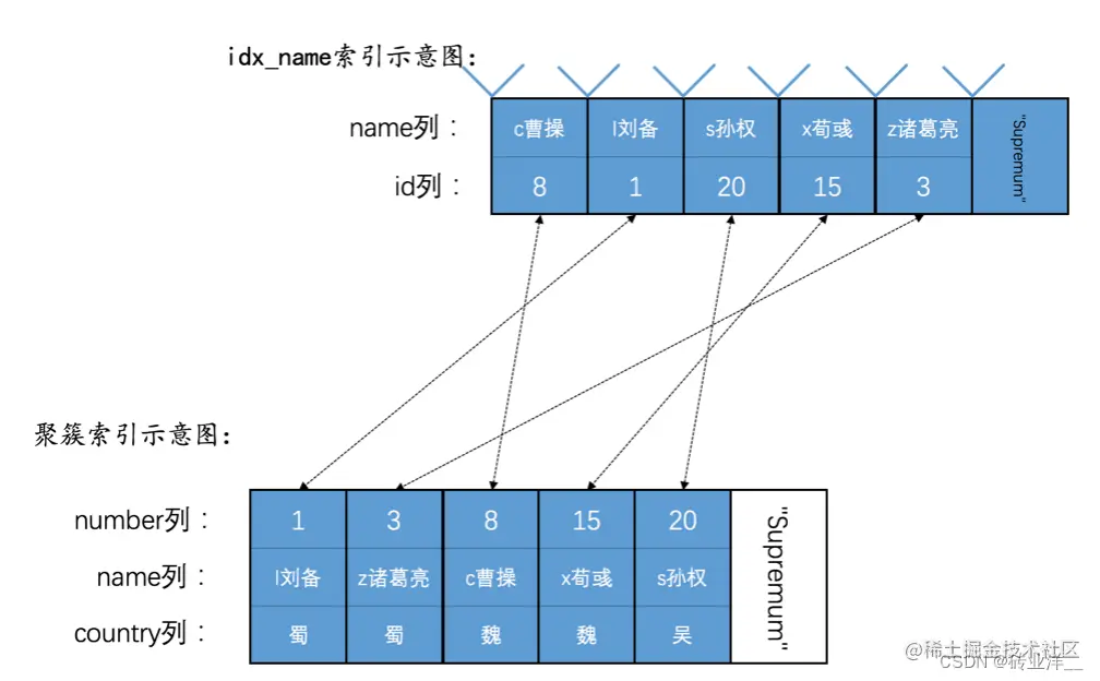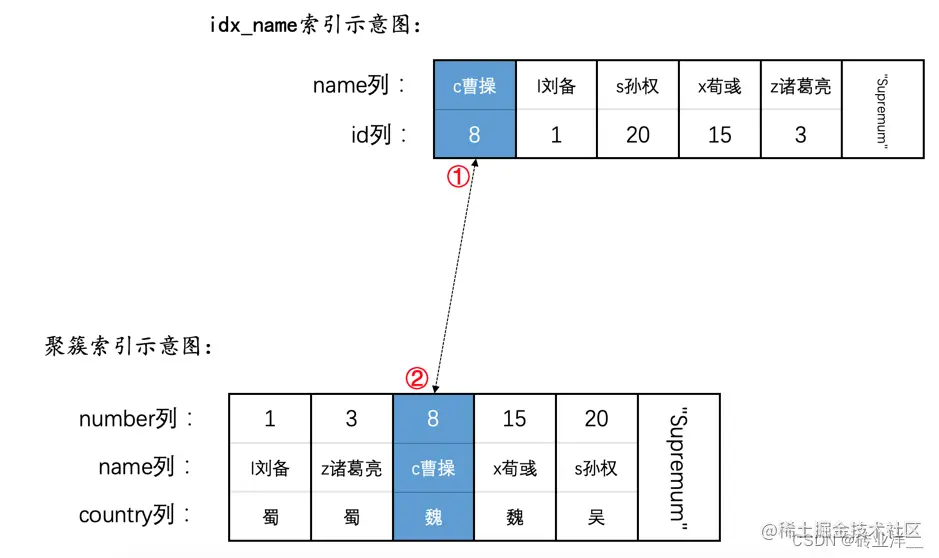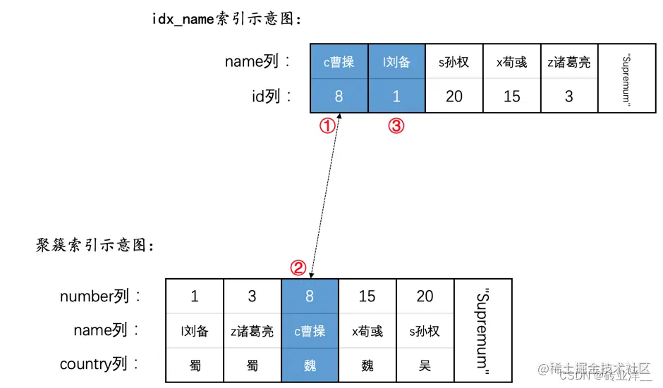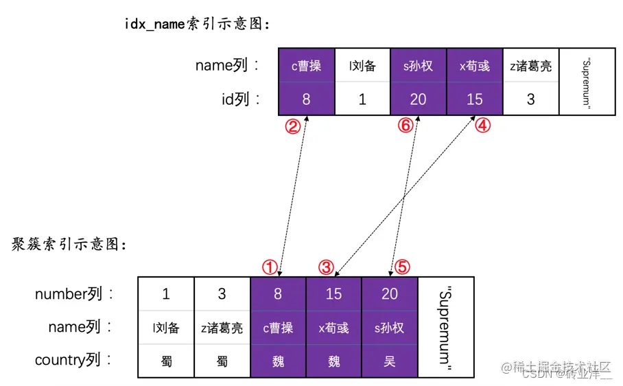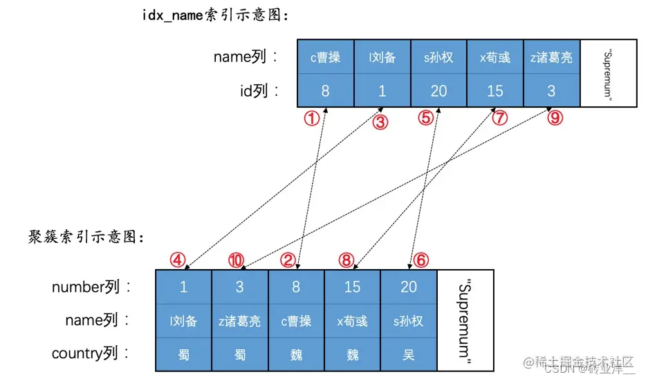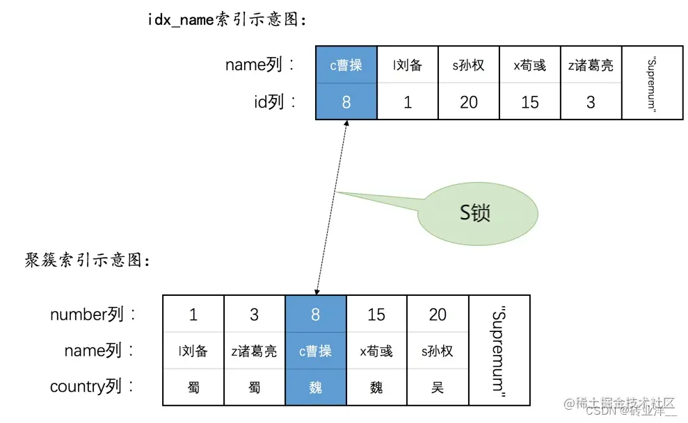 这个语句的执行过程其实是先到二级索引中定位到满足 name >= 'c曹操' 的第一条记录,也就是 name 值为 'c曹操' 的记录,然后就可以沿着这条记录的链表一路向后找,从二级索引 idx_name 的示意图中可以看出,所有的用户记录都满足 name >= 'c曹操' 的这个条件,所以所有的二级索引记录都会被加 S型 next-key锁 ,它们对应的聚簇索引记录也会被加 S锁 ,二级索引的 Supremum 伪记录也会被加 S型 next-key锁 。不过需要注意一下加锁顺序,对一条二级索引记录加锁完后,会接着对它对应的聚簇索引记录加锁,完后才会对下一条二级索引记录进行加锁,以此类推,如下图: