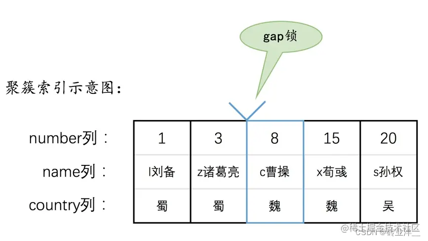 如图中假设有一个事务(事务 A)已经在 number值为 3和 8之间的间隙上加了 Gap Lock。当另一个事务(事务 B)试图插入一条 number值为 4的新记录时,它会首先定位到新记录的下一条记录的 number值为 8。由于事务 A已经在 (3, 8) 这个间隙上加了 Gap Lock,事务 B的插入操作将被阻塞,直到事务 A释放这个 Gap Lock为止。这意味着事务 A需要提交或回滚,从而允许事务 B在 (3, 8)区间插入新记录。(这里把 b+树的索引结构进行超级简化,只把聚集索引叶子结点拿出来)