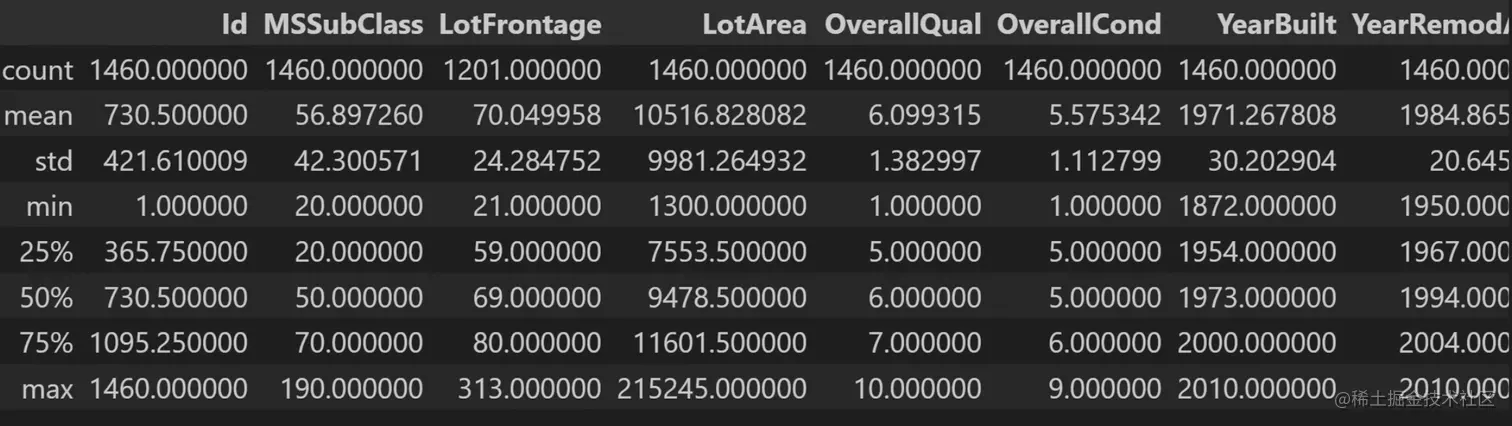之后,对于数据集中存在的每个特征,进行描述性的分析,例如有多少个不同的值,有多少个缺失值,它们对数据集中总缺失值的贡献有多大,分位数统计(例如最小值), Q1、中位数、Q3、最大值、四分位距以及均值、众数、标准差等描述性统计数据。
