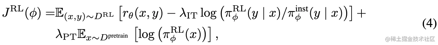 一旦奖励模型训练完成,它将通过 Proximal Policy Optimization (PPO) 更新策略参数 。为了保持预训练和指导微调阶段所获得的能力,相应的损失项被纳入到目标函数中,得到一个扩展的目标函数。 通过最大化以下目标进行训练: