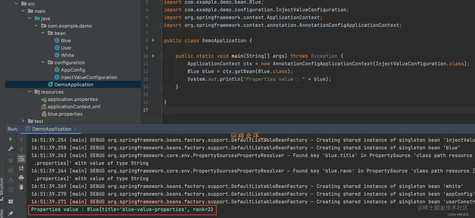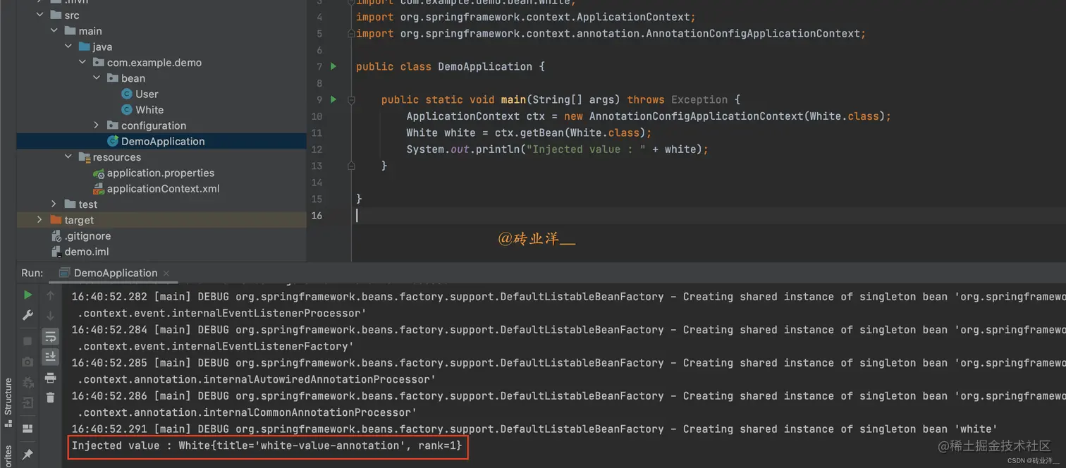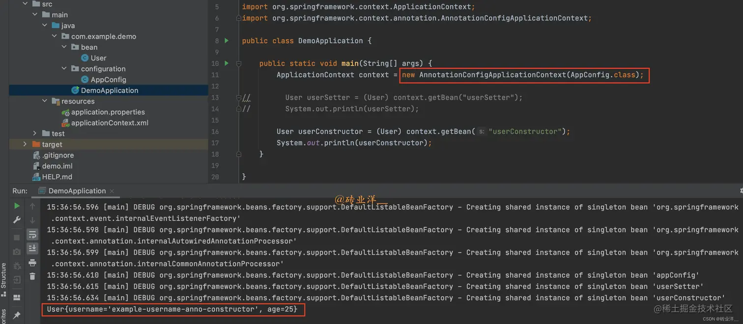 同样,我们需要创建一个 DemoApplication类,使用 AnnotationConfigApplicationContext来加载配置类并获取 Bean: