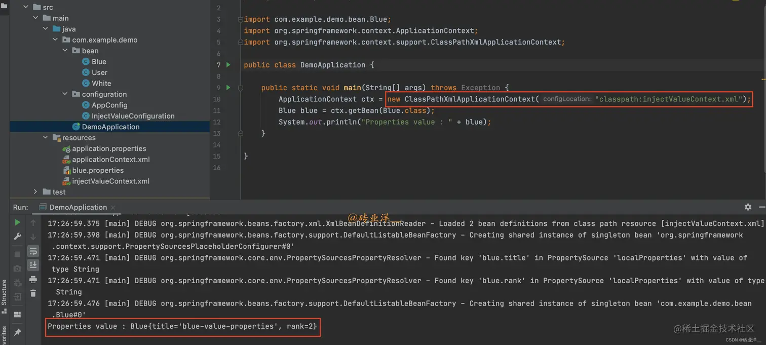 然后,我们需要创建一个 DemoApplication类,使用 ApplicationContext来加载配置文件并获取 Bean: