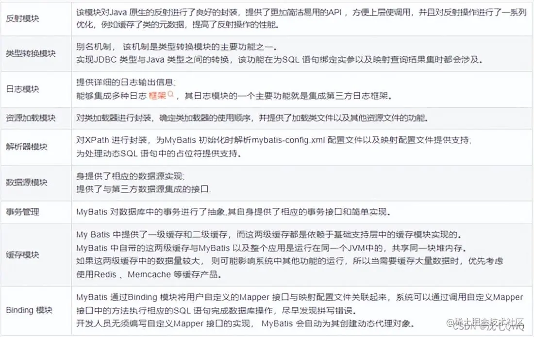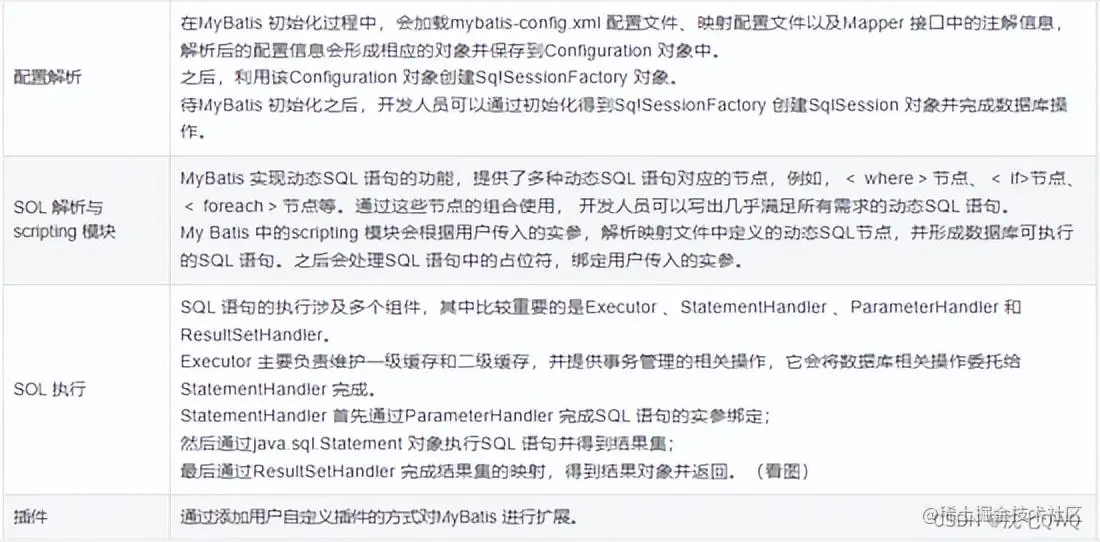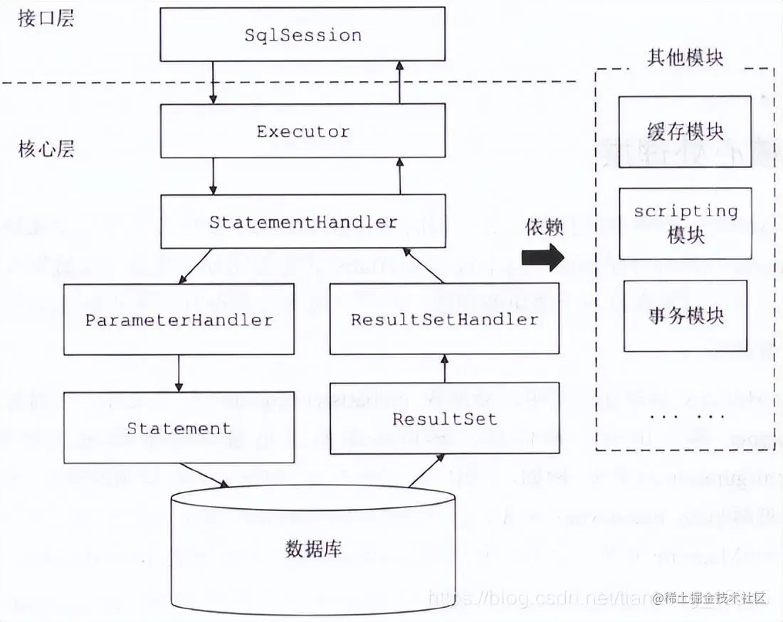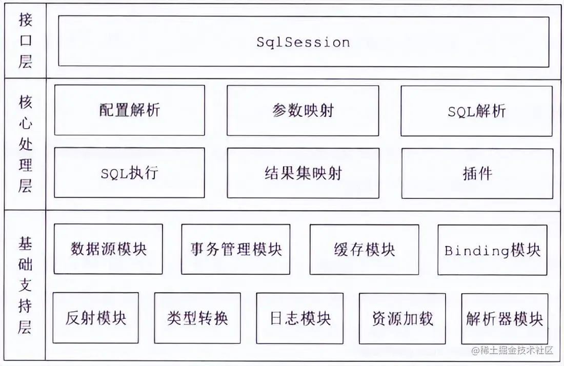 MyBatis 的整体架构分为三层, 分别是基础支持层、核心处理层和接口层: