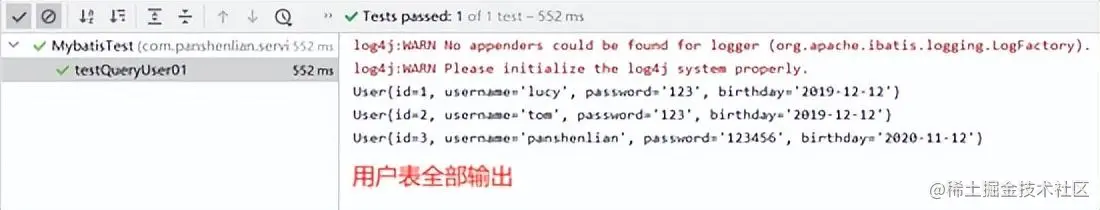 import com.panshenlian.pojo.User; import org.apache.ibatis.io.Resources; import org.apache.ibatis.session.SqlSession; import org.apache.ibatis.session.SqlSessionFactory; import org.apache.ibatis.session.SqlSessionFactoryBuilder; import org.junit.Test; import java.io.IOException; import java.io.InputStream; import java.util.List; public class MybatisTest { @Test public void testQueryUser01() throws IOException { //加载核心配置文件 InputStream resourceAsStream = Resources.getResourceAsStream("SqlMapConfig.xml"); // 获得sqlSession工厂对象 SqlSessionFactory sqlSessionFactory = new SqlSessionFactoryBuilder().build(resourceAsStream); //获得sqlSession对象 SqlSession sqlSession = sqlSessionFactory.openSession(); // 执行sql语句 List userList = sqlSession.selectList("userMapper.findAll"); // 打印结果 for (User user : userList) { System.out.println(user); } // 释放资源 sqlSession.close(); } }