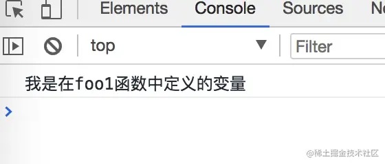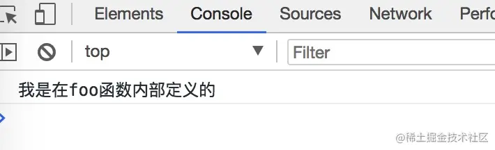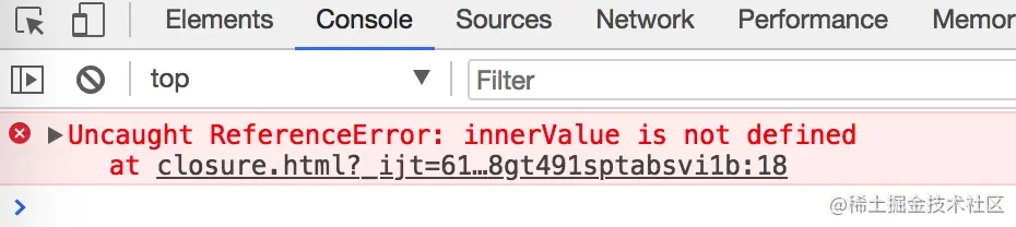 可以在控制台中看到运行效果如上,我们在foo函数外部是无法访问foo函数内部所定义的变量的。所以浏览器会抛出一个ReferenceError的错误。表示在当前的词法作用域中并没有找到innerValue这个变量。