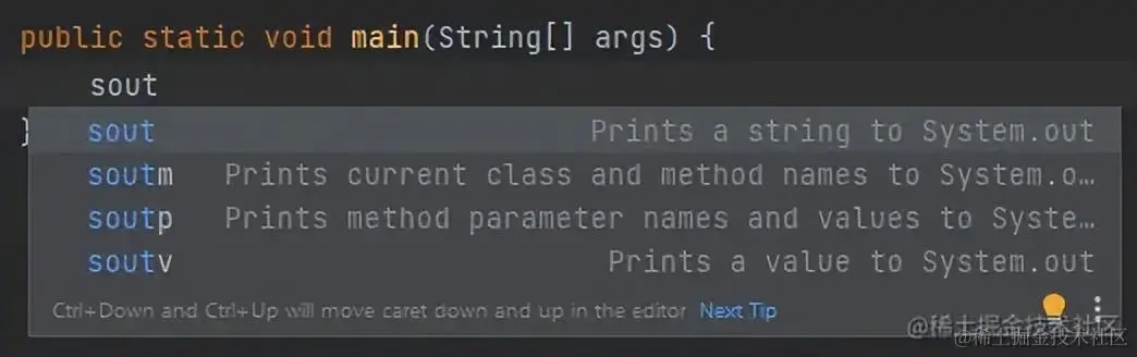 打印输出一些内容到控制台也是频率很高的一个行为,我们可以使用sout命令快速创建出System.out.println来打印内容。