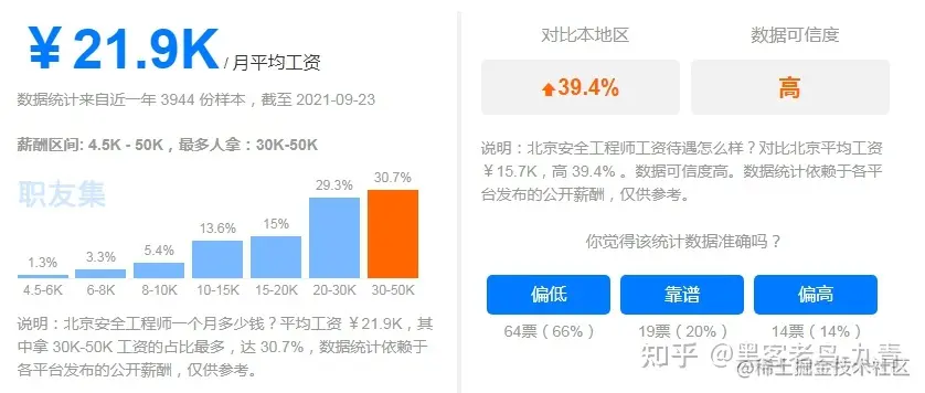 由于网络安全人才供应严重匮乏,这种供求不平衡直接反映在安全工程师的薪资上。2021年平均薪资高达21.9K,有57.9%的人薪资在10-30K,30.7%的人薪资在30K以上,薪资比同地区其他岗位的薪资高39.4%,说明这个职位需求非常大