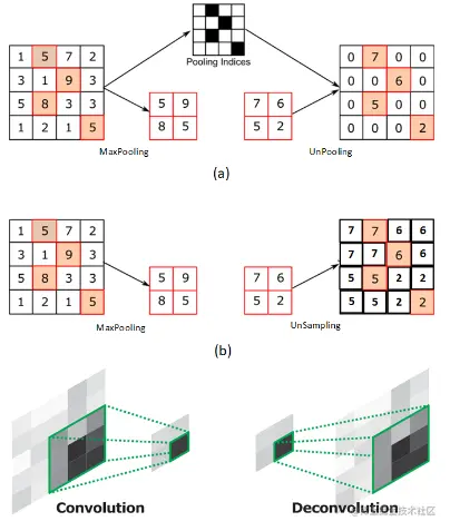 下图 (a) 表示反池化,(b) 表示上采样,(c) 表示反卷积。