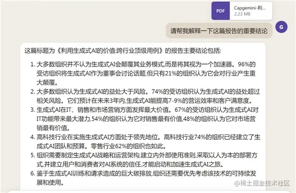 你还可以上传 PDF 等文件,基于这些文件进行对话,上下文长度比 GPT 更大。例如,如果你有一份关于生成式 AI 的行业报告,你可以对 Claude 2 说:“请你解释一下这份报告的重要结论。”这个功能对于 ChatGPT 来说是一个巨大的突破。