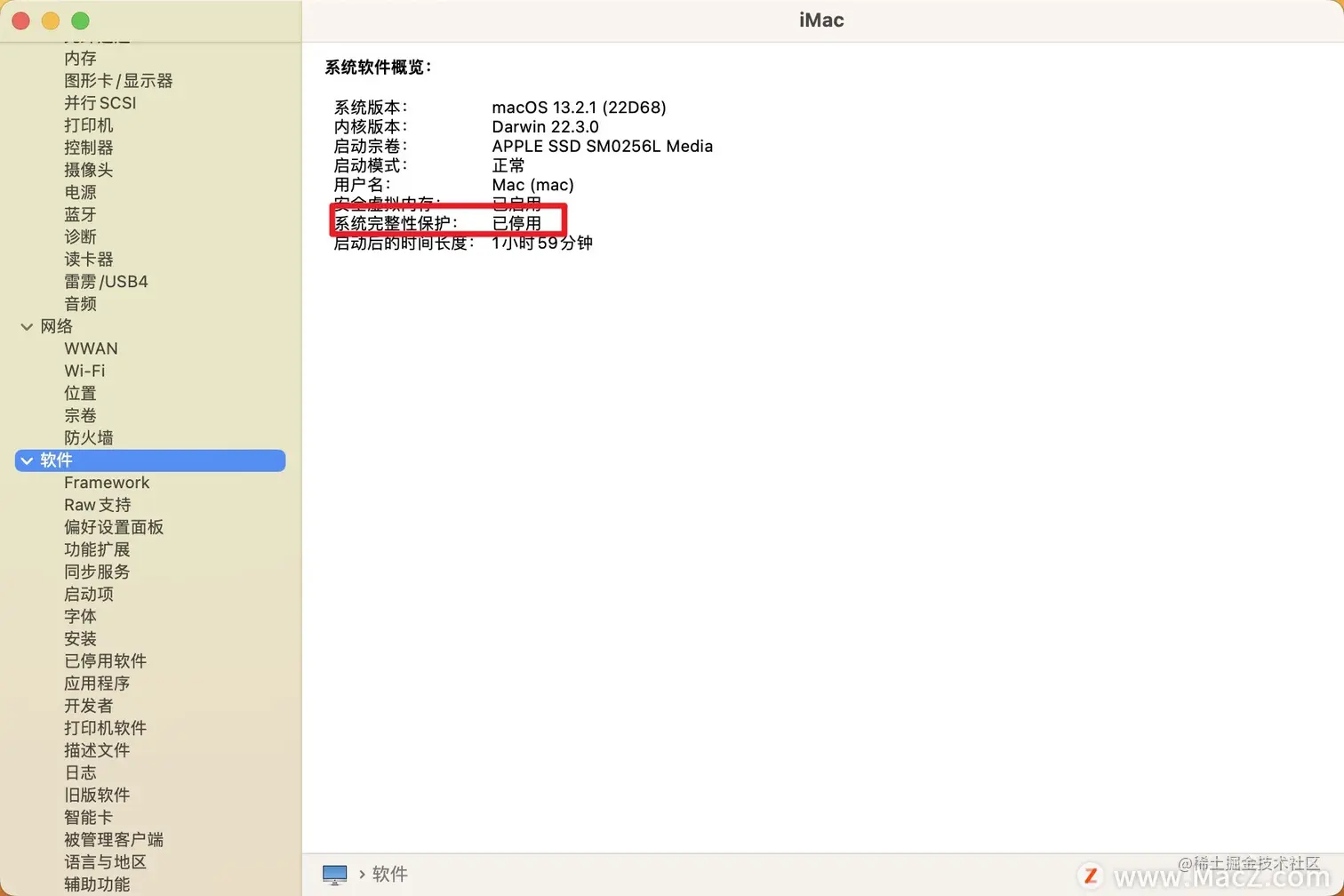 - 右侧查找「系统完整性保护」,看到「已启用」或「已禁用」消息