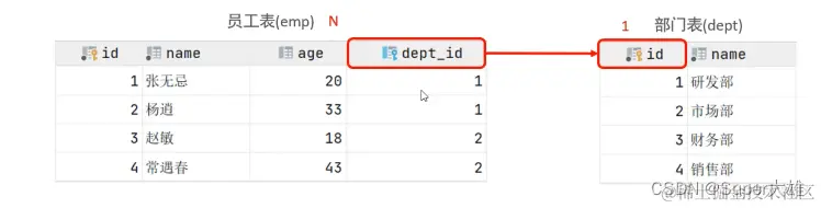 案例:部门与员工的关系 关系:一个部门对应多个员工,一个员工对应一个部门 实现: 在多的一方建立外键,指向一的一方的主键