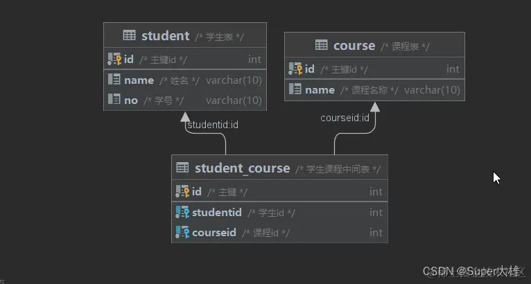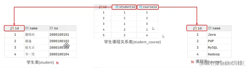 案例: 学生与 课程的关系 关系:一个学生可以选修多门课程,一门课程也可以供多个学生选择 实现:建立第三张中间表,中间表至少包含两个外键,分别关联两方主键