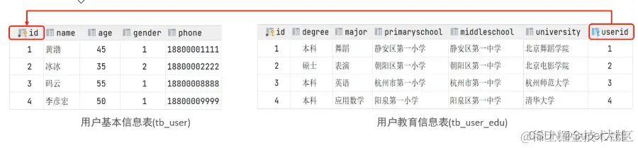 案例: 用户与 用户详情的关系 关系:一对一关系,多用于单表拆分,将一张表的基础字段放在一张表中,其他详情字段放在另一张表中,以提升操作效率 实现: 在任意一方加入外键,关联另外一方的主键,并且设置外键为唯一的(UNIQUE)