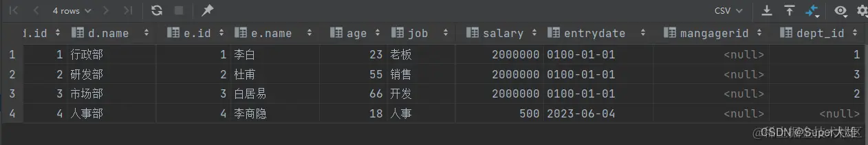 注意: 对于联合查询的多张表的列数必须保持一致,字段类型也需要保持一致。 union all 会将全部的数据直接合并在一起,union 会对合并之后的数据去重。