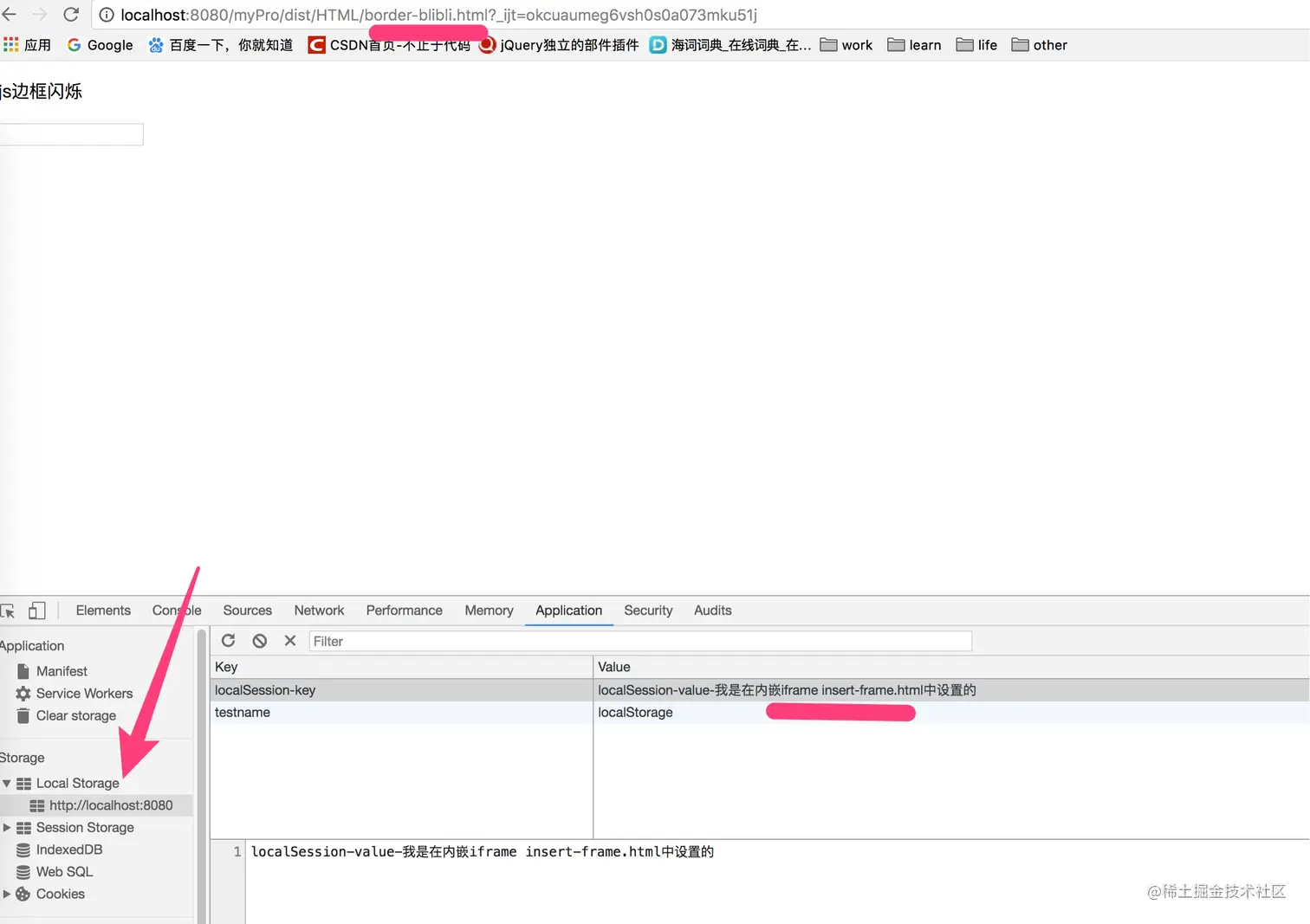 这时候我们先验证一下LocalStorage满足同源策略,在同源下打开另一个页面(上述截图注意url部分页面是iframe.html),我们打开同源下另一个页面,border-blibli.html
