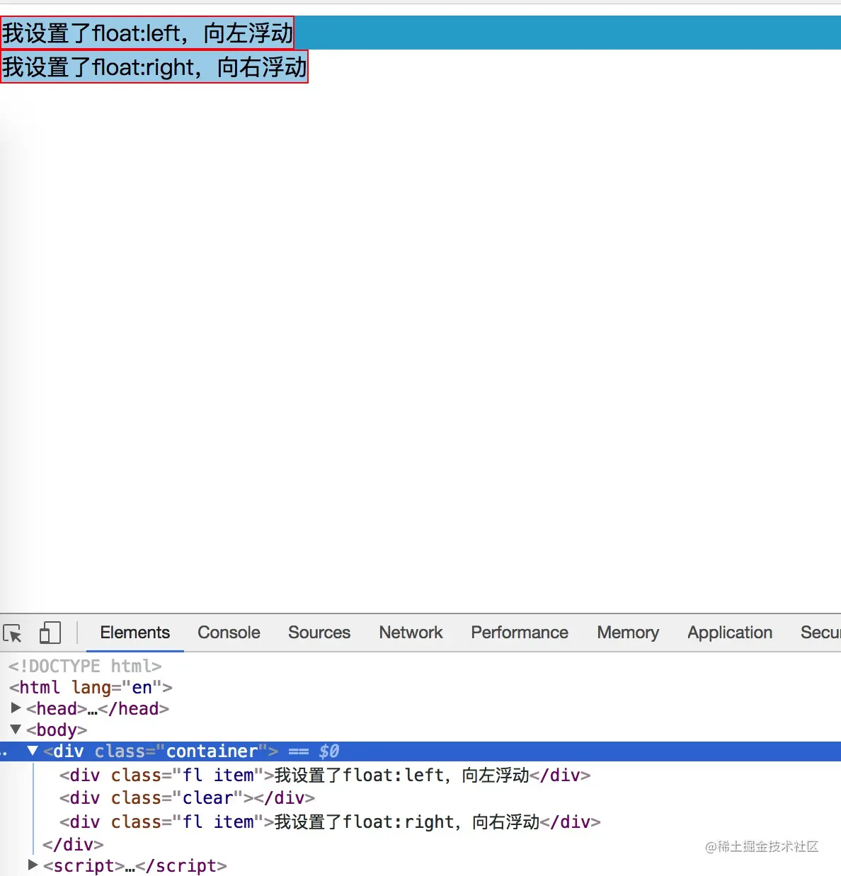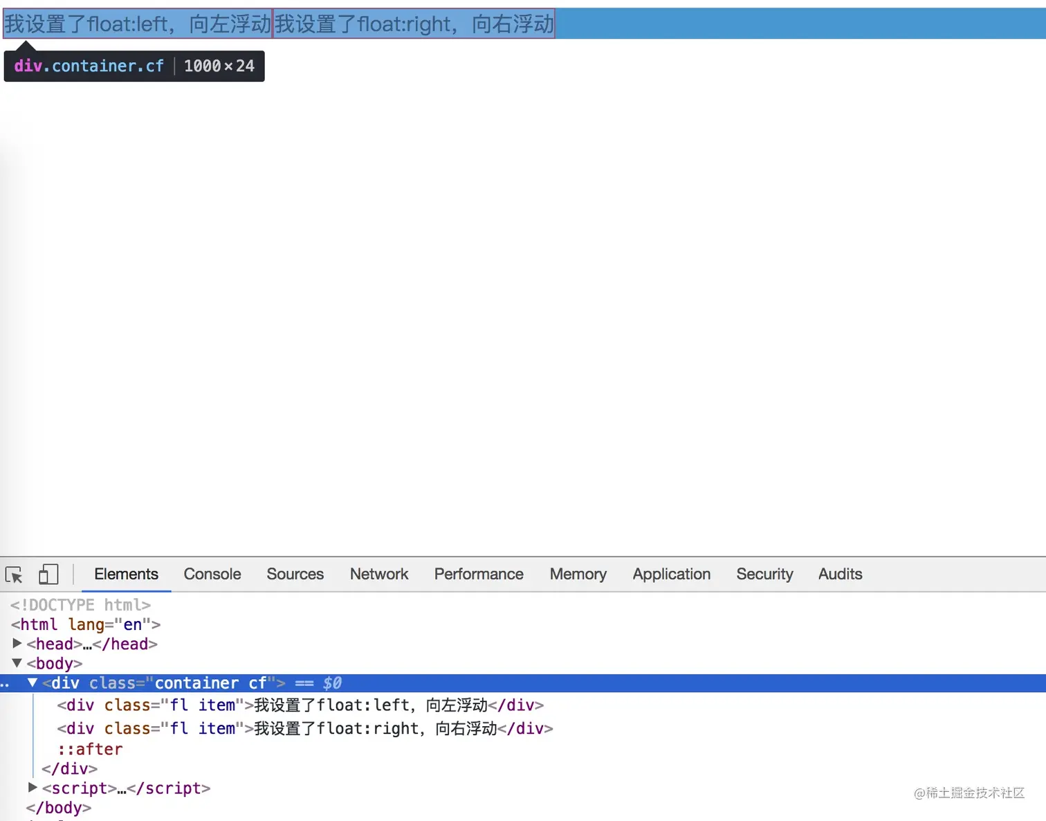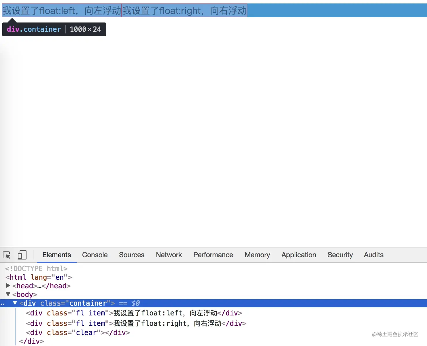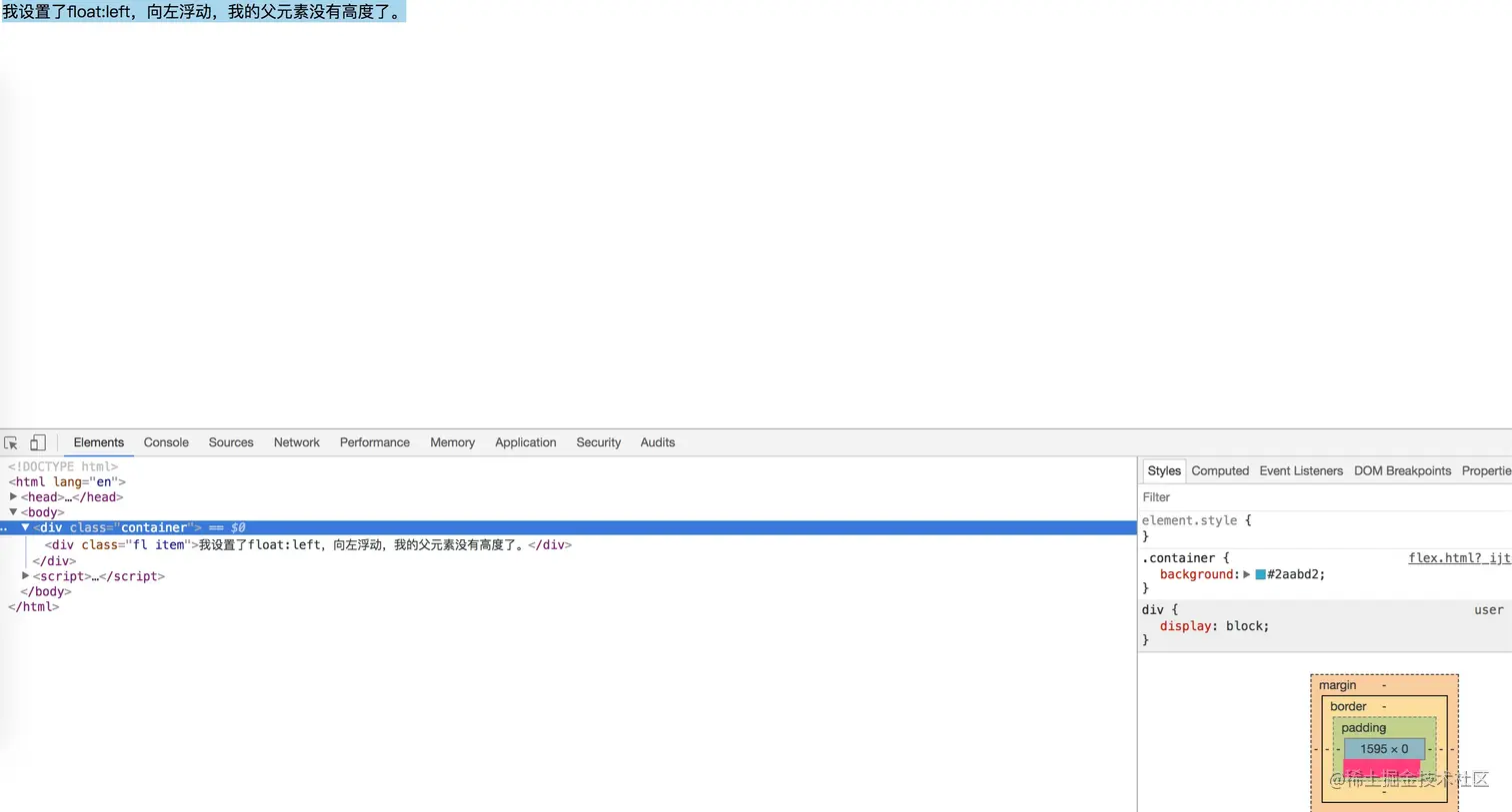可以看到结尾添加了一个空的div标签设置clear:both,那么父元素的高度自然也就有了,这儿需要注意,这里的空标签div需要加在这个container的最后一个,先让浮动浮起来,不然若是将这个clear元素放在前面的话,那左右两边就不能浮动了。