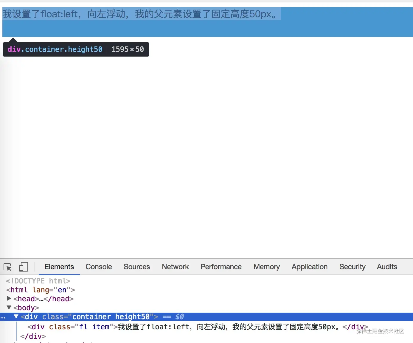 <div class="fl item">我设置了float:left,向左浮动,我的父元素设置了固定高度50px。</div>