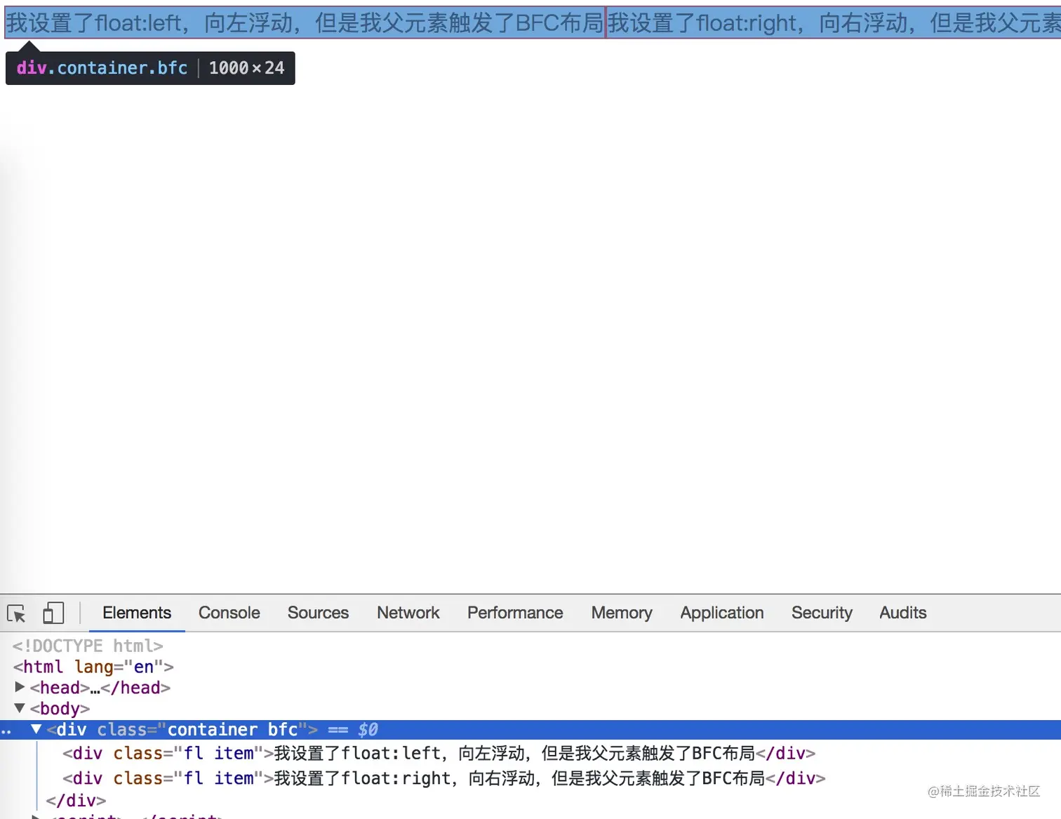 <div class= "fl item" >我设置了float:left,向左浮动,但是我父元素触发了BFC布局</div>