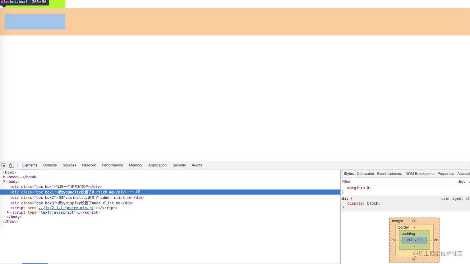 可以看到,当我们在dom结构中选择了这个dom节点的时候,在页面上也是占有位置的,就这点而言和opcity:0的表现是一样的。