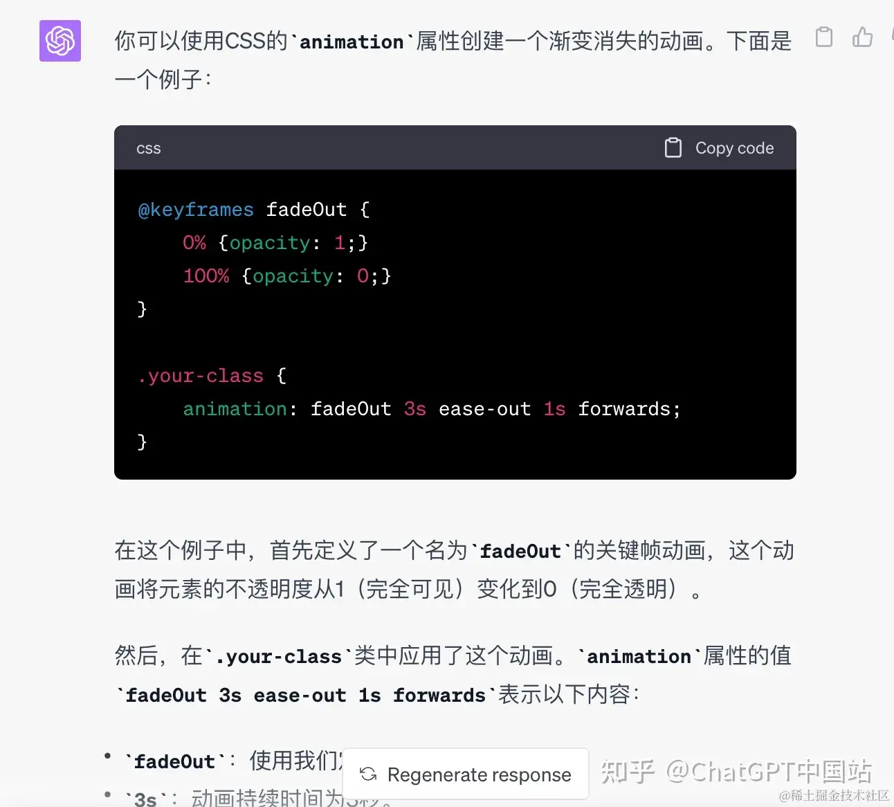问:写一个css动画,3秒内渐变消失,延迟1秒执行,消失后不再出现