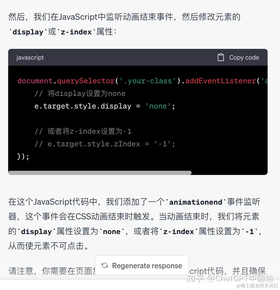 问:要求动画结束后,该元素不可点击,即display为none或z-index为负