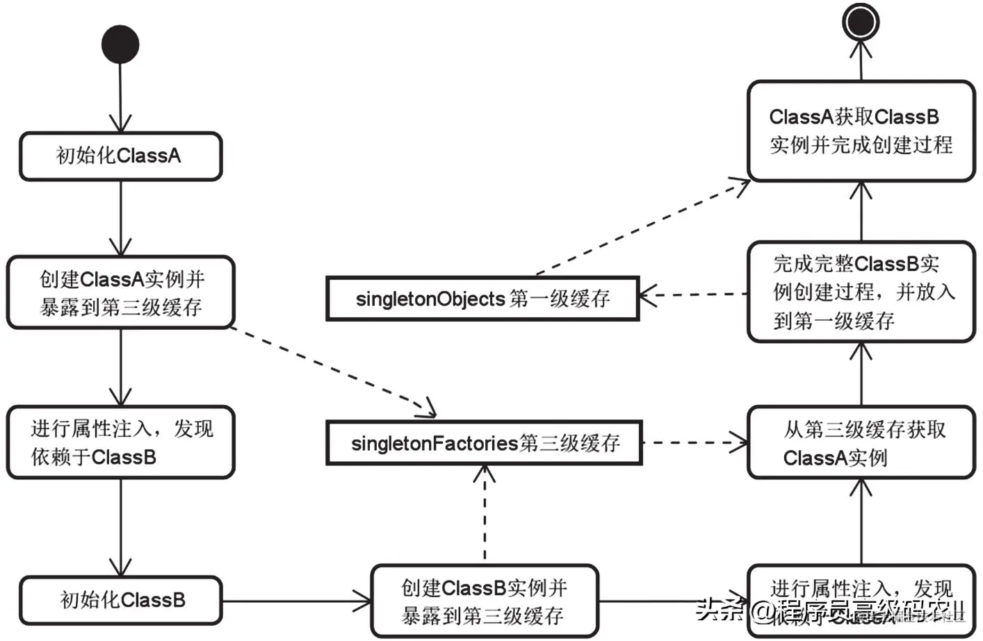 显然,这时候ClassB还没有被创建,所以要走创建流程。ClassB在初始化第一步的时候发现自己依赖了ClassA,就会尝试从第一级缓存singletonObjects去获取ClassA的实例。因为ClassA这时候还没有被创建完毕,所以它在第一级缓存和第二级缓存中都不存在。当尝试访问第三级缓存时,因为ClassA已经提前暴露了,所以ClassB能够通过singletonFactories拿到ClassA对象并顺利完成所有初始化流程。