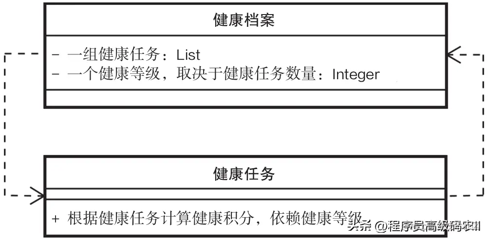 这个案例描述了医疗健康类系统中的一个常见场景,每个用户都有一份健康档案,存储着代表用户当前健康状况的健康等级以及一系列的健康任务。用户每天可以通过完成医生所指定的任务来获取一定的健康积分,而这个积分的计算过程取决于该用户当前的健康等级。也就是说,不同的健康等级下完成同一个任务所能获取的积分也是不一样的。反过来,等级的计算也取决于该用户当前需要完成的任务数量,任务越多说明用户越不健康,其健康等级也就越低。健康档案和健康任务之间的关联关系如图2-4所示。
