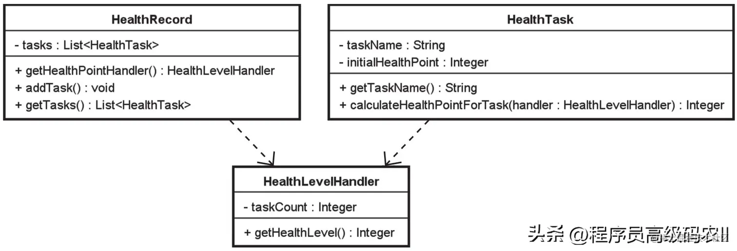 HealthRecord去实现这个接口。我们同样将这个接口命名为HealthLevelHandler,其中包含一个计算健康等级的方法定义。这样,HealthTask在计算积分时只需要依赖这个业务接口,而不需要关心这个接口的具体实现类,如图2-7所示。