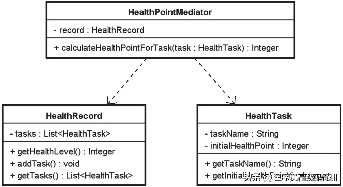 这个中介者组件的实现也非常简单,通过提供一个计算积分的方法来对循环依赖进行了剥离,该方法同时依赖于HealthRecord和HealthTask对象,并实现了原有HealthTask中根据HealthRecord的等级信息进行积分计算的业务逻辑。中介者HealthPointMediator类的实现代码如代码清单2-24所示。