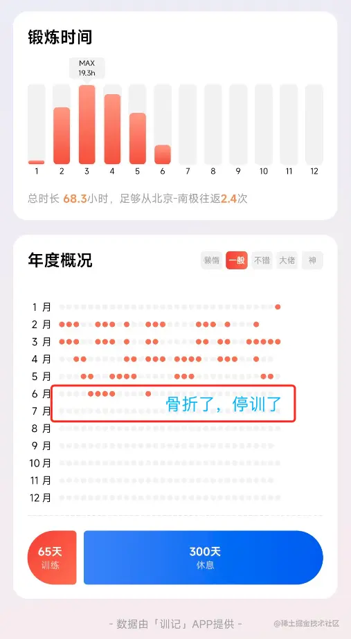 坚持运动80+天,身体素质提升不少,另外感觉精力比平时旺盛了很多。基本上180天有150+天7点前起床,6月前基本上一周健身房锻炼4-5天,周末6点早起回龙观体育公园打篮球。公司有健身房+健身塔子两个buff叠满让我很好的坚持了一阵子,上半年训记统计有65天健身记录,算上打球和跑步感觉也还能及格了。身体素质明显有改善,在6月中旬骨折之前打球都很嚣张。参加了1818公园足球娱乐组,整体还不错,大半年给我晒黑了不少,幸好崴脚骨折这一个月天天在家不见日月,皮肤稍微恢复了一点。