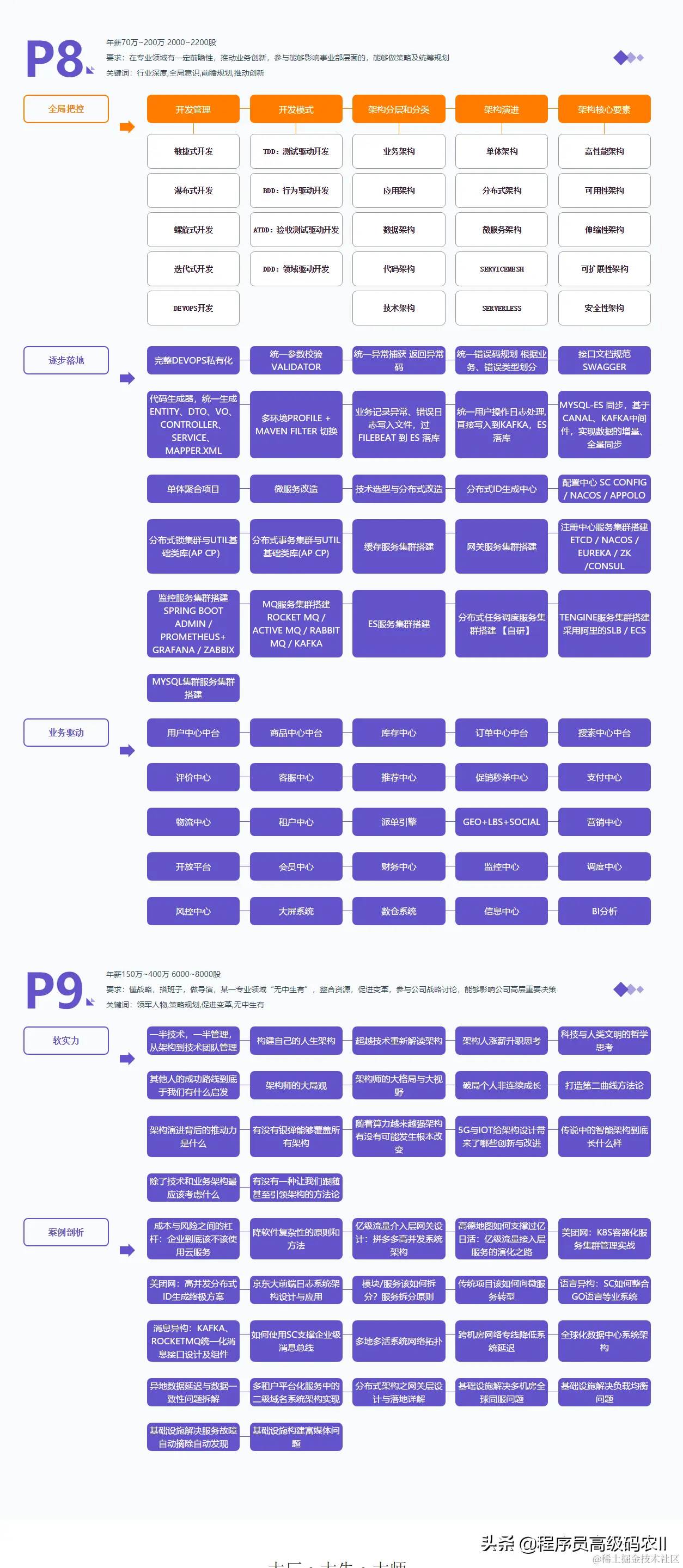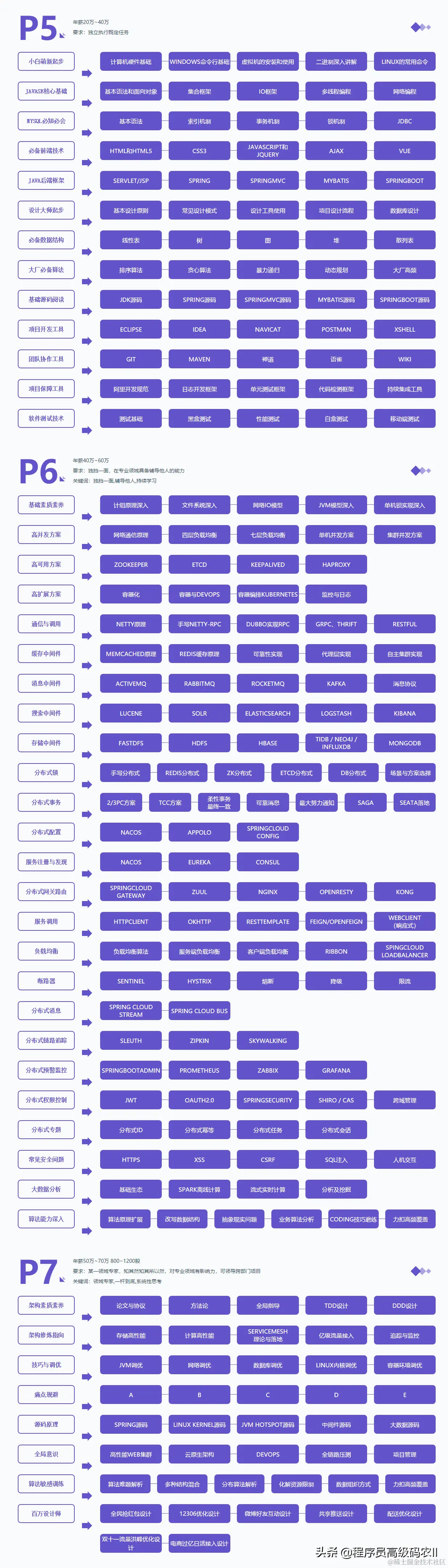 下面就给大家分享一波对标阿里p5到P7职级所掌握的技术栈和薪资水平的路线,后续还有P8到P9的路线。