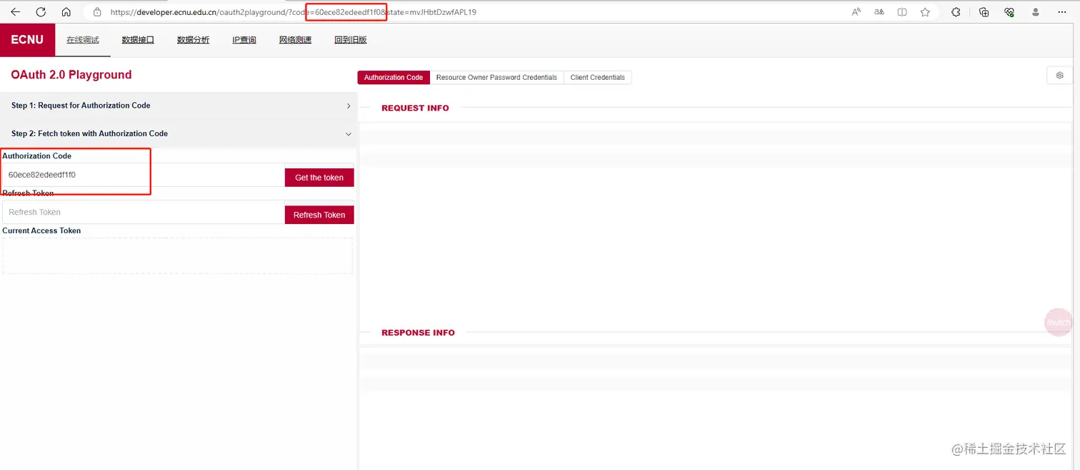 授权通过后,根据协议将携带 code 回到 redirect_uri,可以看到 code 已经被自动填入了。我们点击获取 token 即可。