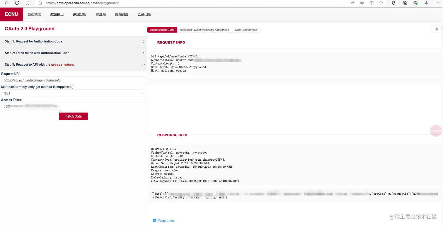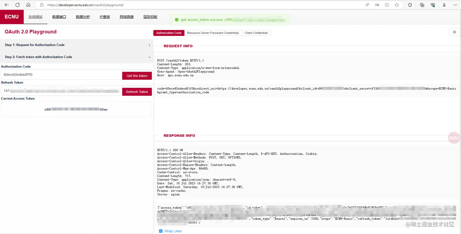 点击获取 token 后,可以在右侧的 request/response 内看到详细的请求内容,这对开发者的调试工作有非常大的帮助,在左侧也可以看到 ,access_token 已经获取到,并且也已经自动填充了 refresh_token,如果需要测试 refresh_token 的功能,同样在其右侧点击获取 token 即可。
