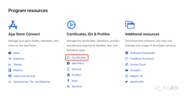 首先我们先去苹果开发者后台 App Store Connect 来生成证书,浏览器登录 developer.apple.com/account,在 Program resources 一栏中选择 Certificates