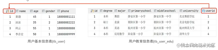 案例: 用户与 用户详情的关系 关系:一对一关系,多用于单表拆分,将一张表的基础字段放在一张表中,其他详情字段放在另一张表中,以提升操作效率 实现: 在任意一方加入外键,关联另外一方的主键,并且设置外键为唯一的(UNIQUE)