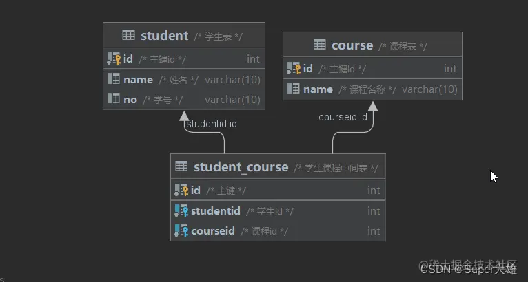 案例: 学生与 课程的关系 关系:一个学生可以选修多门课程,一门课程也可以供多个学生选择 实现:建立第三张中间表,中间表至少包含两个外键,分别关联两方主键
