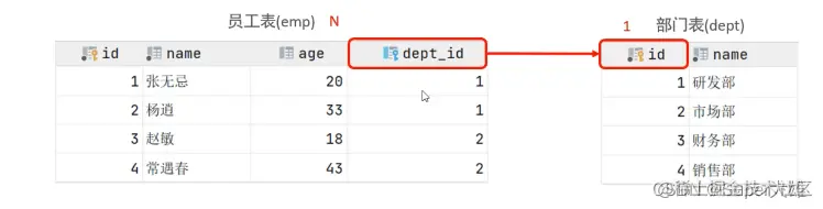 案例:部门与员工的关系 关系:一个部门对应多个员工,一个员工对应一个部门 实现: 在多的一方建立外键,指向一的一方的主键