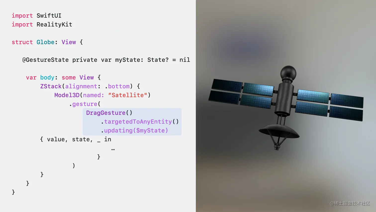 回到渲染卫星的卫星视图,请注意,DragGesture 允许我点击并拖动模型,随着我的交互而移动。