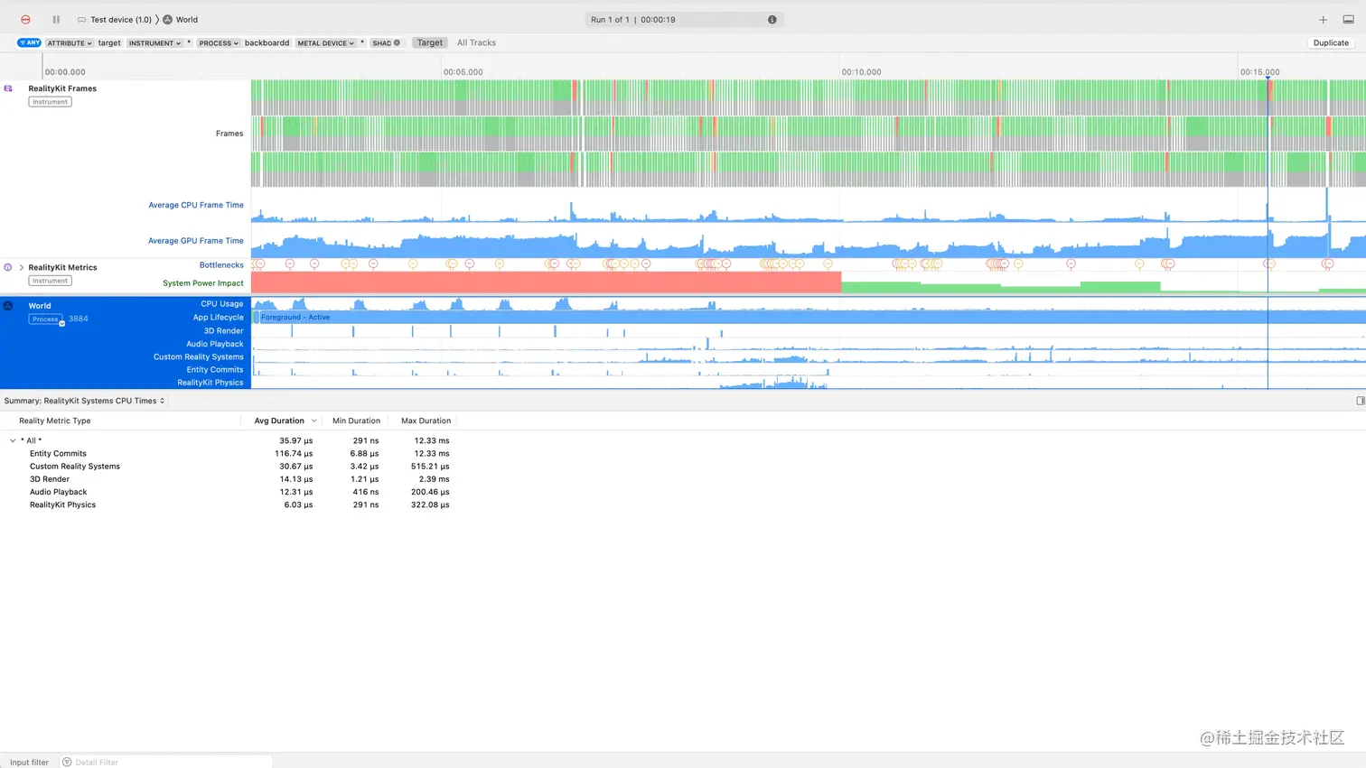 RealityKit Trace 模板具有新工具,使开发人员能够了解其应用程序的 GPU、CPU 和系统功耗影响,并识别性能热点。