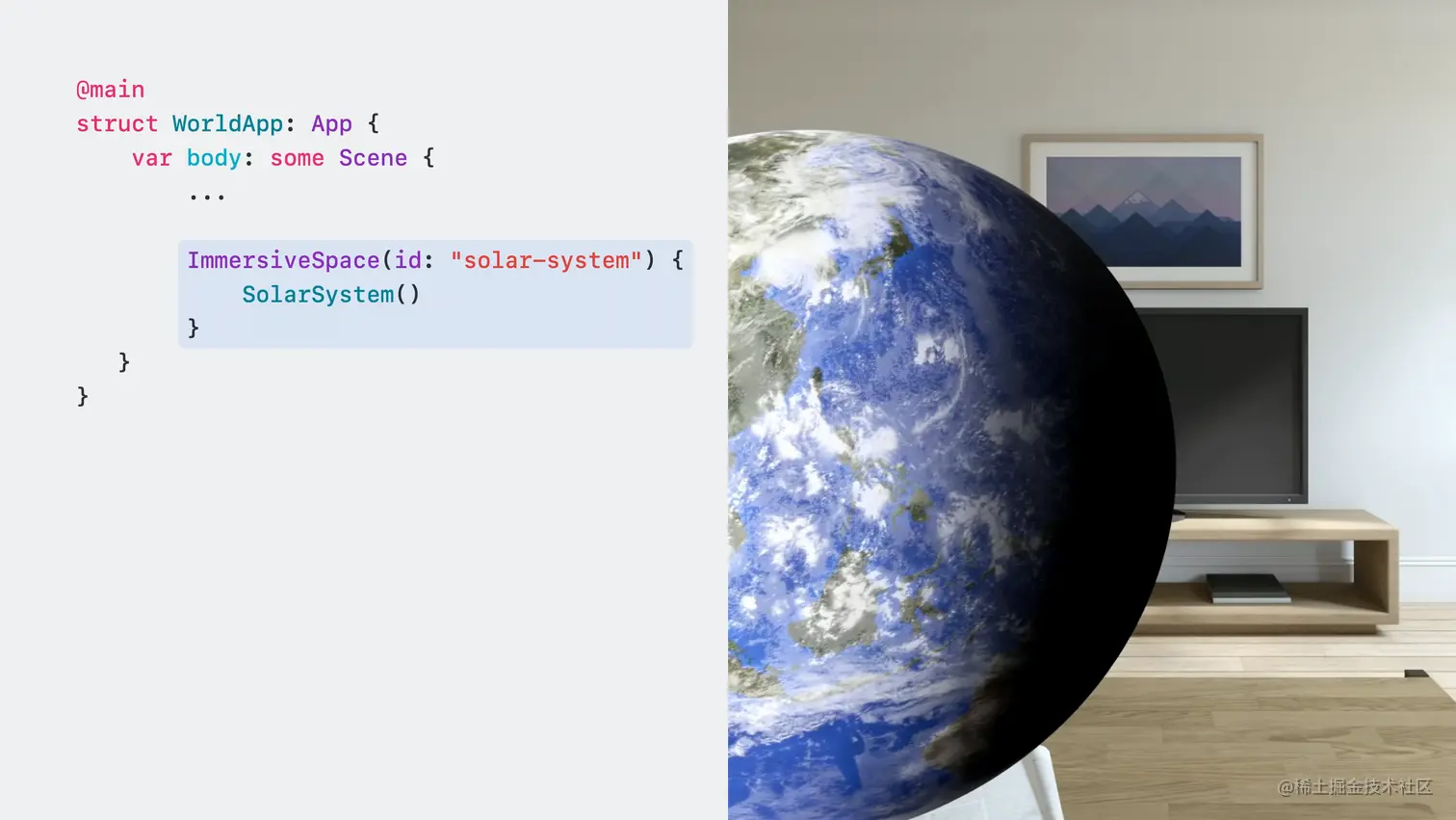而且因为 Full Space 是一个 SwiftUI 场景,所以我可以使用 RealityView 来显示地球。