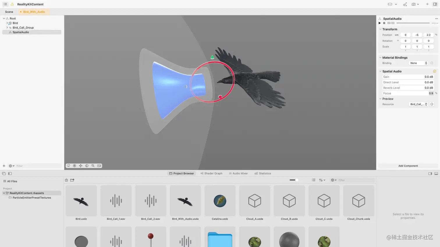 在空间上预览音频,这会适配整个场景的形状和上下文,比如示例中空间音频具有空间方向特性。