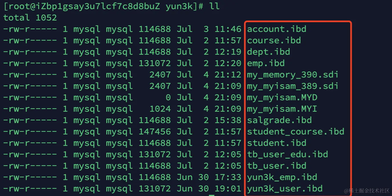 如果该参数开启,代表对于InnoDB引擎的表,每一张表都对应一个ibd文件。我们直接打开MySQL的数据存放目录,这个目录下有很多文件夹,不同的文件夹代表不同的数据库,我们直接打开yun3k文件夹。