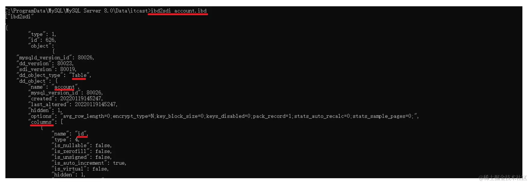 可以看到里面有很多的idb文件,每一个ibd文件就对应一张表,比如:我们有一张表account,就会有这样一个account.ibd文件,而在这个ibd文件中不仅存放表结构、数据、还会存放该表对应的索引信息。而该文件是基于二进制存储的,不能直接基于记事本打开,我们可以使用mysql提供的一个指令ibd2sdi,通过该指令就可以从ibd文件中提取sdi信息,而sdi数据字典信息中就包含该表的表结构。