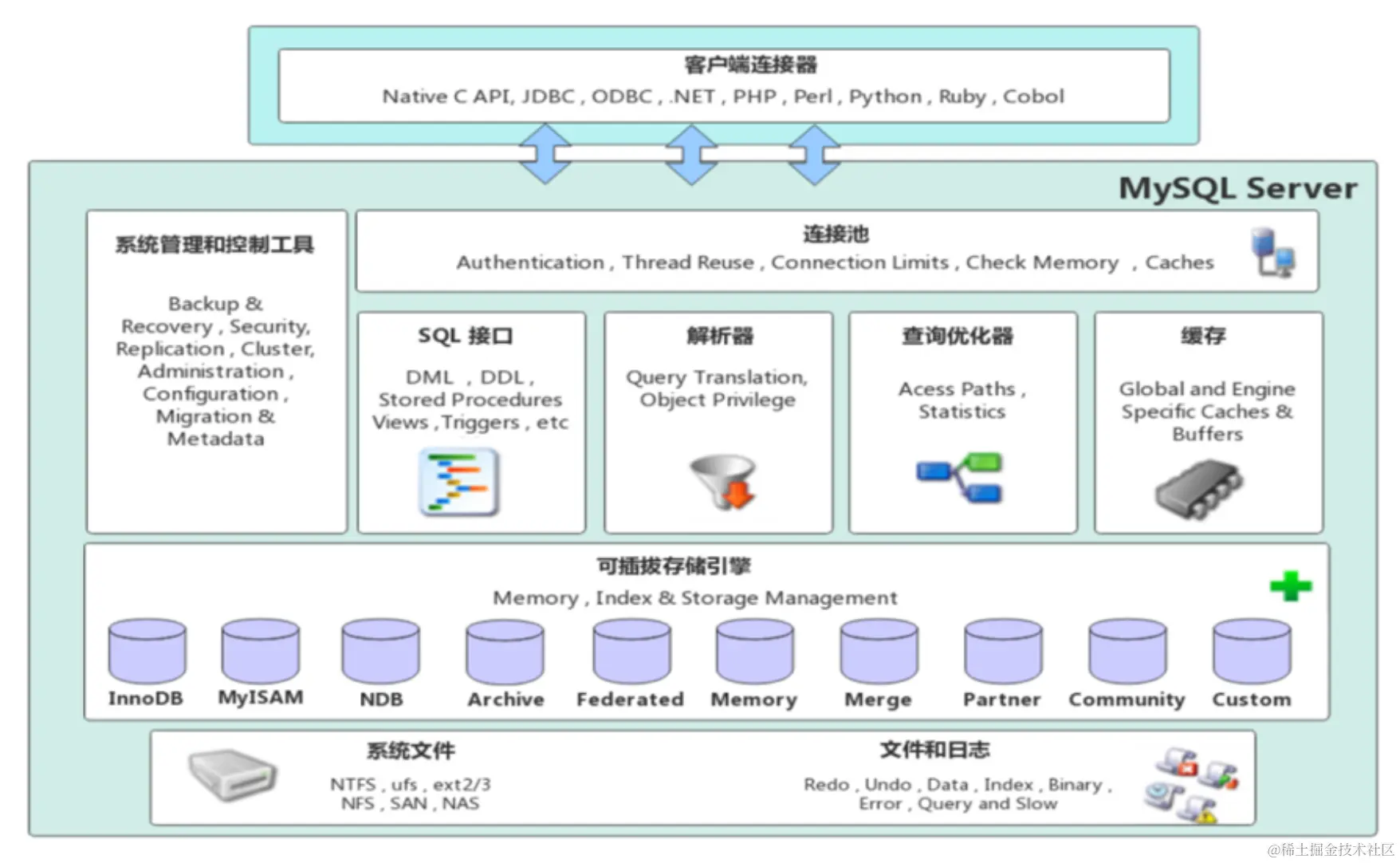 数据存储层,主要是将数据(如:redolog、undolog、数据、索引、二进制日志、错误日志、查询日志、慢查询日志等)存储在文件系统之上,并完成与存储引擎的交互。