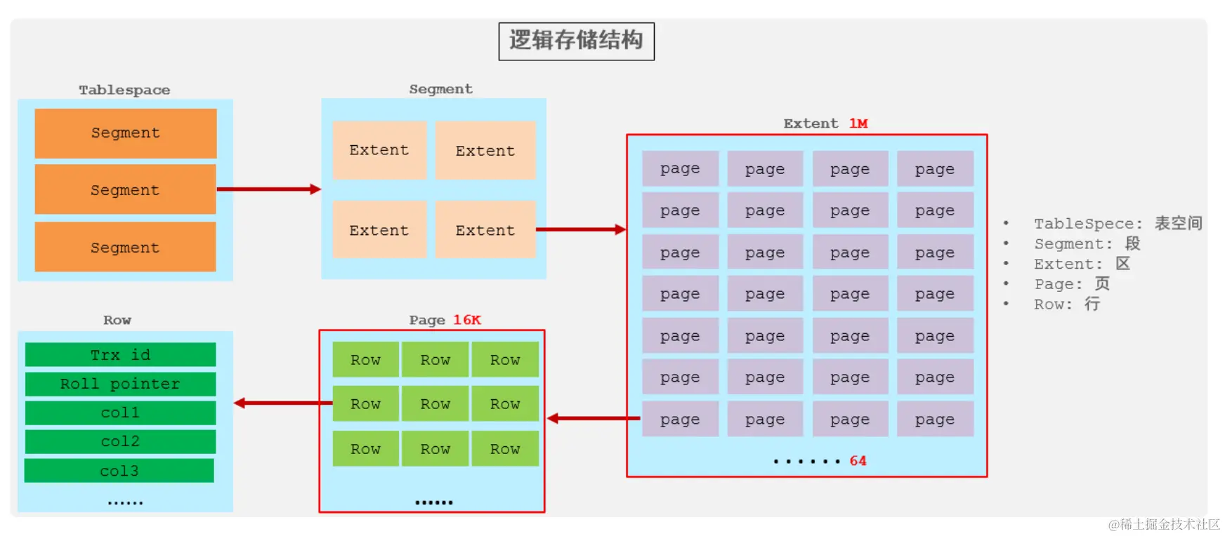 - 区:区是表空间的单元结构,每个区的大小为1M。默认情况下,InnoDB存储引擎页大小为16k,即一个区中一共有64个连续的页。