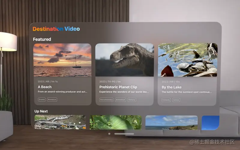 在模拟器中构建并运行你的应用,查看其外观。visionOS 的模拟器有一个虚拟背景作为你的应用内容的背景。使用你的键盘和鼠标或触摸板在环境中导航并与你的应用互动。