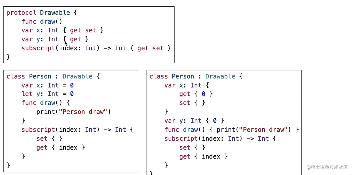 协议定义get、set,用var存储属性或get、 set计算属性去实现