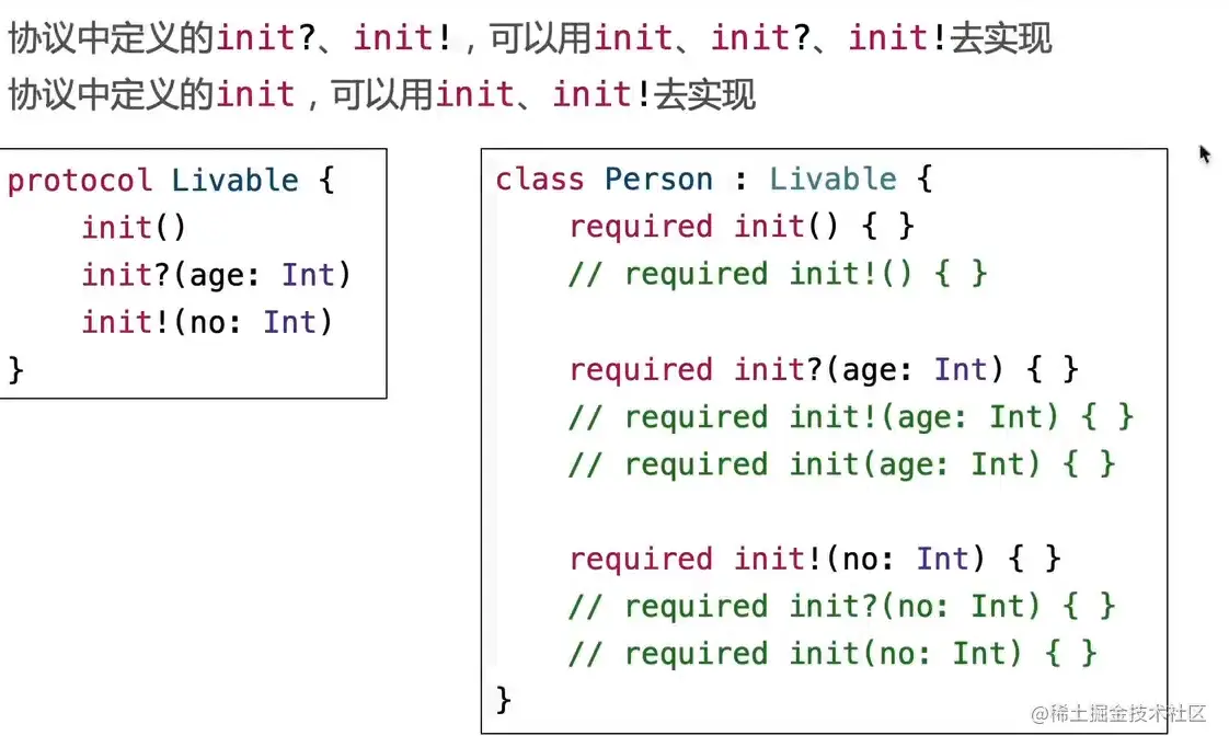 协议中还可以定义初始化器init (非final类实现时必须加上required)