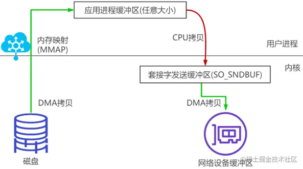 当调用sendfile()时,DMA将磁盘数据复制到kernel buffer,然后将内核中的kernel buffer直接拷贝到socket buffer。在硬件支持的情况下,甚至数据都并不需要被真正复制到socket关联的缓冲区内。取而代之的是,只有记录数据位置和长度的描述符被加入到socket缓冲区中,DMA模块将数据直接从内核缓冲区传递给协议引擎,从而消除了遗留的最后一次复制。