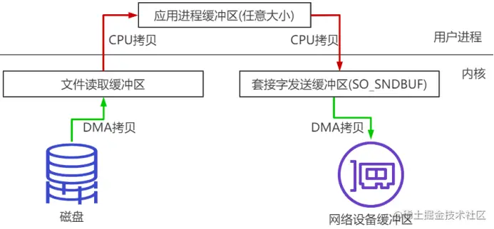 比如:读取文件,再用socket发送出去,实际经过四次copy。